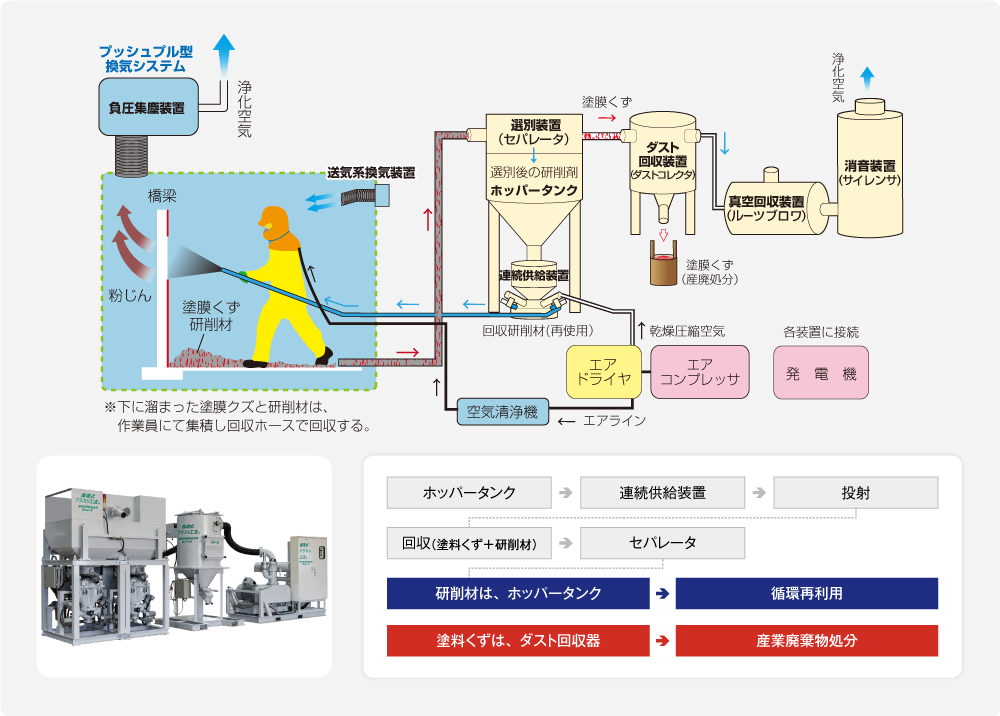 4)養生を「剥がす」ブラストには業界で一般的なサンドブラスト方式ではなく、 環境に優しい方式を採用しています。